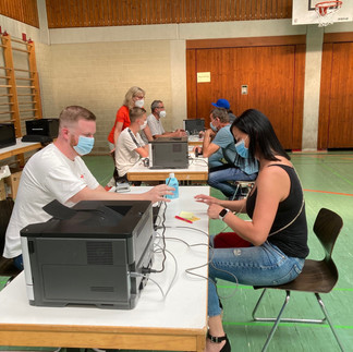 Routiniert führte das Impfteam die Vorbesprechungen für die Impfwilligen und die Impfungen durch. Flankiert wurden sie dabei von vielen ehrenamtlichen Helferinnen und Helfern aus Wolfach. Dabei halfen etwa die Damen der Katholischen Frauengemeinschaft beim herrichten der Brötchen und der Butterbrezeln, die ich gespendet hatte.